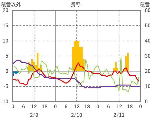 | 日 | 時 | 気温 | 降水 | 風向/風速 | 日照 | 積雪 | 降雪 |
