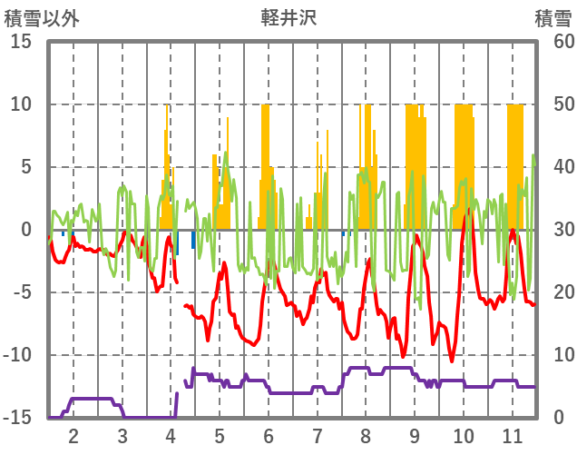 | 日 | 時 | 気温 | 降水 | 風向/風速 | 日照 | 積雪 | 降雪 |