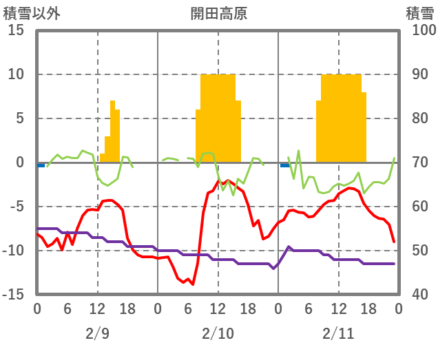 | 日 | 時 | 気温 | 降水 | 風向/風速 | 日照 | 積雪 | 降雪 |