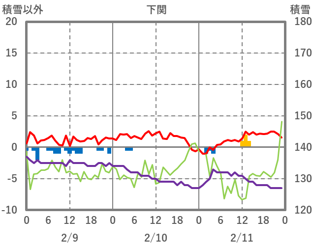 | 日 | 時 | 気温 | 降水 | 風向/風速 | 日照 | 積雪 | 降雪 |