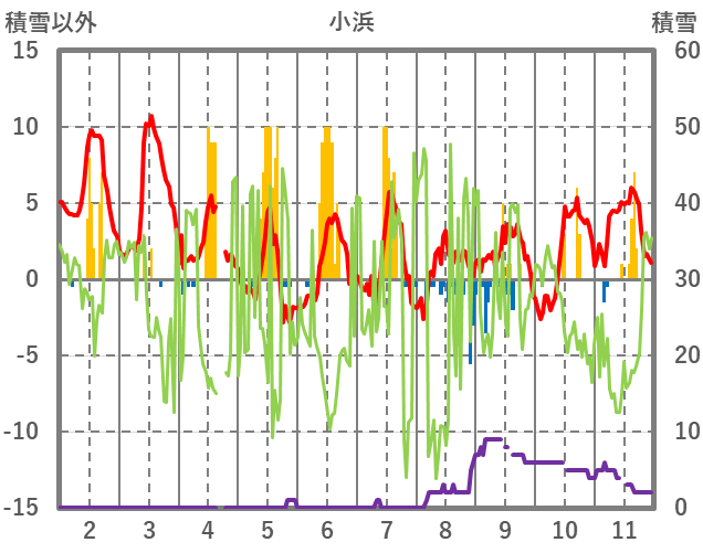 | 日 | 時 | 気温 | 降水 | 風向/風速 | 日照 | 積雪 | 降雪 |