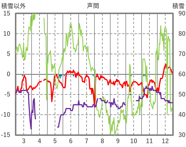 | 日 | 時 | 気温 | 降水 | 風向/風速 | 日照 | 積雪 | 降雪 |