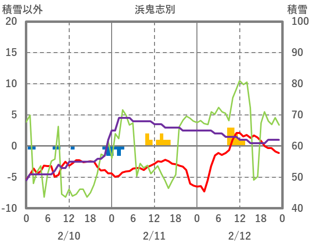| 日 | 時 | 気温 | 降水 | 風向/風速 | 日照 | 積雪 | 降雪 |