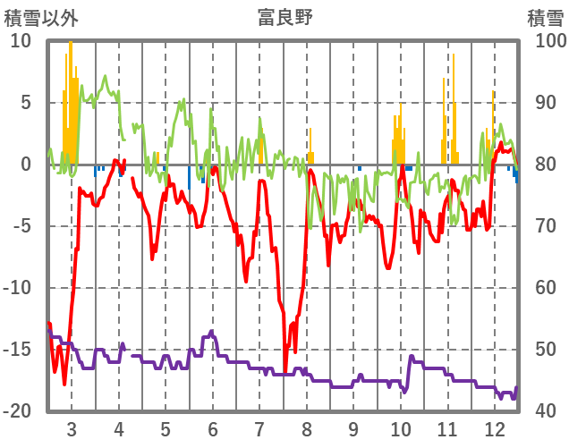 | 日 | 時 | 気温 | 降水 | 風向/風速 | 日照 | 積雪 | 降雪 |