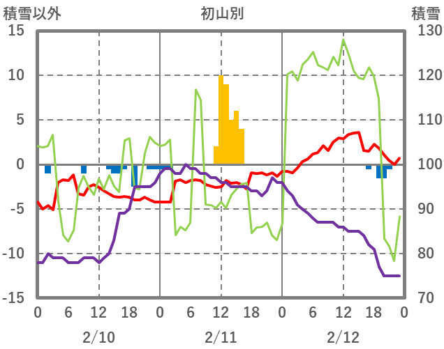 | 日 | 時 | 気温 | 降水 | 風向/風速 | 日照 | 積雪 | 降雪 |