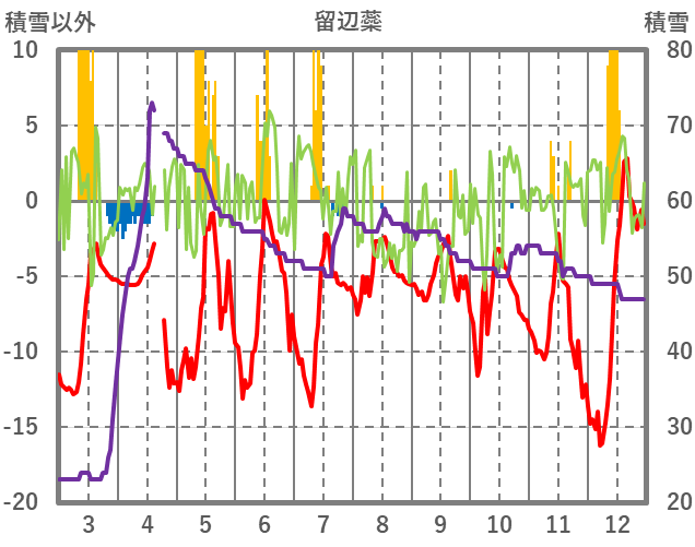 | 日 | 時 | 気温 | 降水 | 風向/風速 | 日照 | 積雪 | 降雪 |