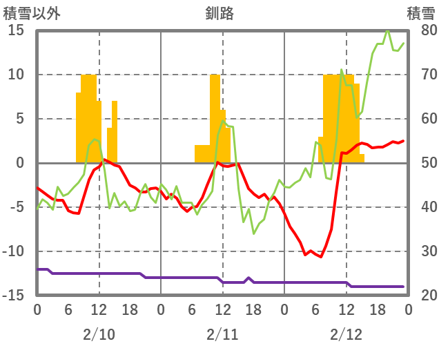 | 日 | 時 | 気温 | 降水 | 風向/風速 | 日照 | 積雪 | 降雪 |