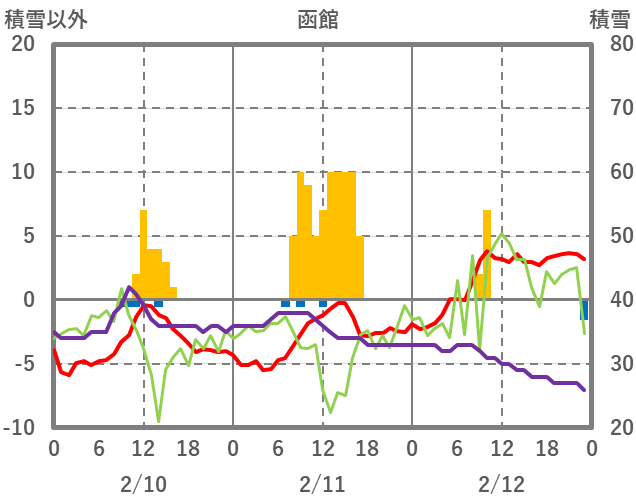 | 日 | 時 | 気温 | 降水 | 風向/風速 | 日照 | 積雪 | 降雪 |