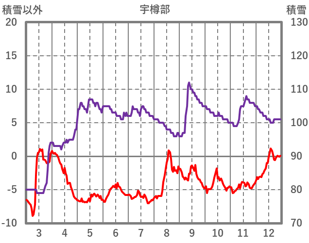 | 日 | 時 | 気温 | 降水 | 風向/風速 | 日照 | 積雪 | 降雪 |
