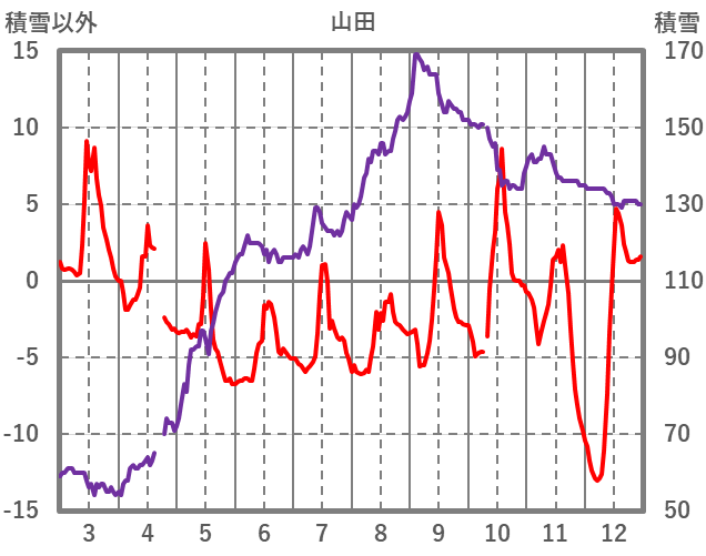 | 日 | 時 | 気温 | 降水 | 風向/風速 | 日照 | 積雪 | 降雪 |