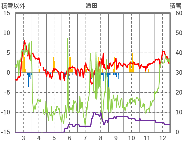 | 日 | 時 | 気温 | 降水 | 風向/風速 | 日照 | 積雪 | 降雪 |