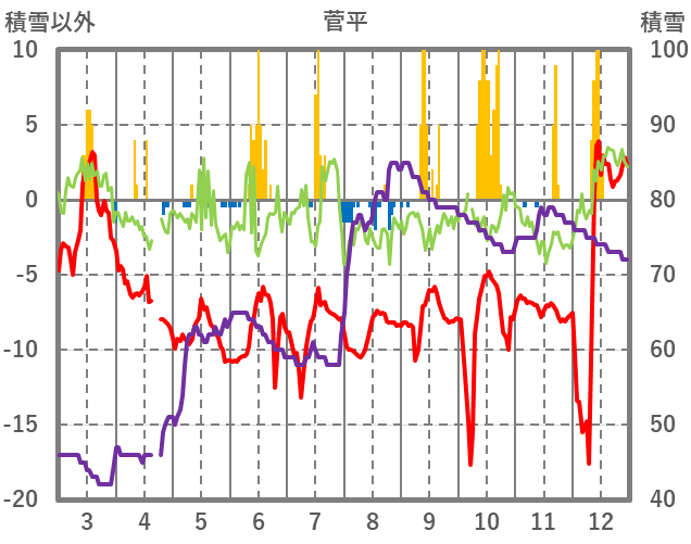 | 日 | 時 | 気温 | 降水 | 風向/風速 | 日照 | 積雪 | 降雪 |