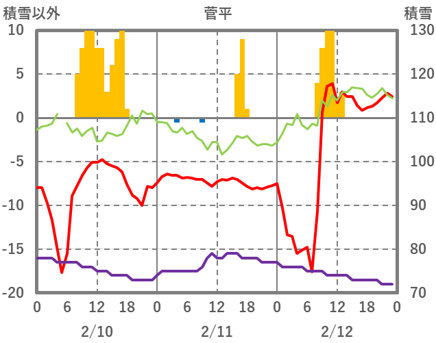 | 日 | 時 | 気温 | 降水 | 風向/風速 | 日照 | 積雪 | 降雪 |