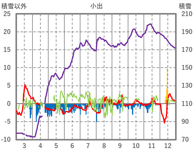 | 日 | 時 | 気温 | 降水 | 風向/風速 | 日照 | 積雪 | 降雪 |