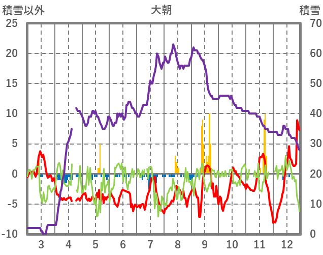 | 日 | 時 | 気温 | 降水 | 風向/風速 | 日照 | 積雪 | 降雪 |