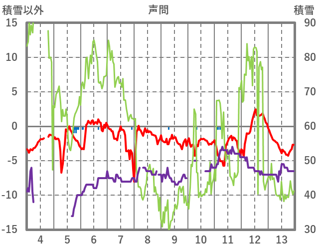 | 日 | 時 | 気温 | 降水 | 風向/風速 | 日照 | 積雪 | 降雪 |