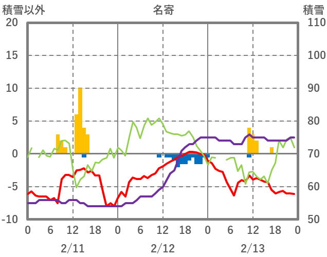 | 日 | 時 | 気温 | 降水 | 風向/風速 | 日照 | 積雪 | 降雪 |