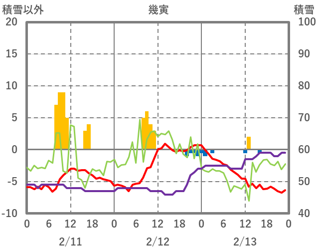 | 日 | 時 | 気温 | 降水 | 風向/風速 | 日照 | 積雪 | 降雪 |