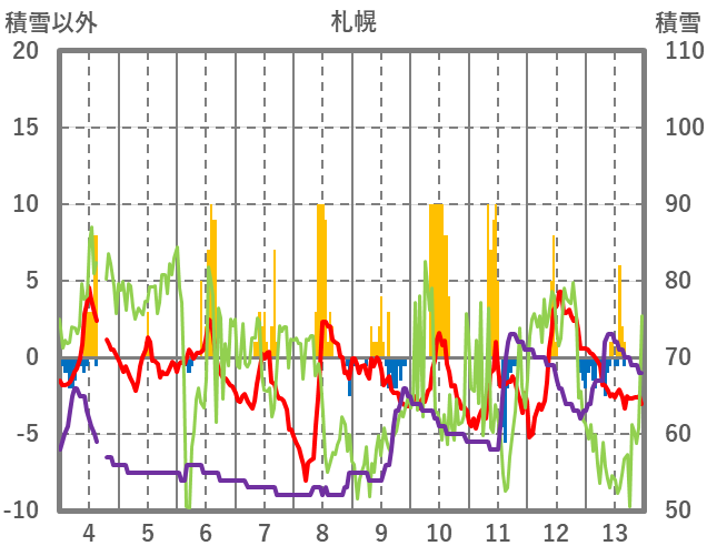 | 日 | 時 | 気温 | 降水 | 風向/風速 | 日照 | 積雪 | 降雪 |