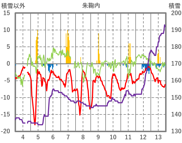 | 日 | 時 | 気温 | 降水 | 風向/風速 | 日照 | 積雪 | 降雪 |