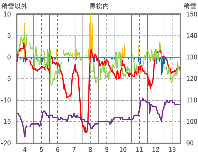 | 日 | 時 | 気温 | 降水 | 風向/風速 | 日照 | 積雪 | 降雪 |
