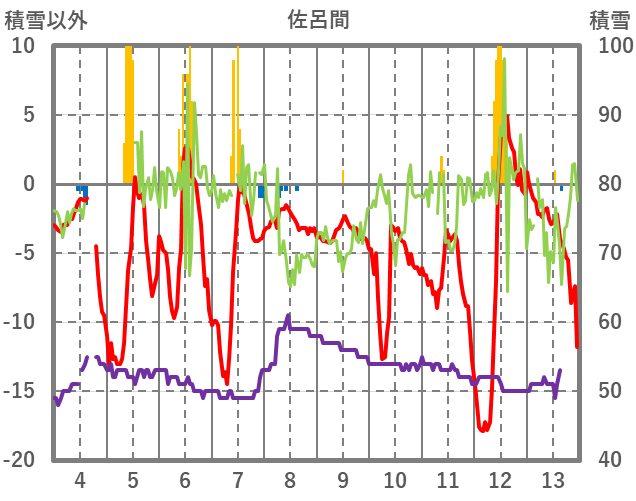 | 日 | 時 | 気温 | 降水 | 風向/風速 | 日照 | 積雪 | 降雪 |