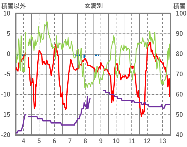 | 日 | 時 | 気温 | 降水 | 風向/風速 | 日照 | 積雪 | 降雪 |