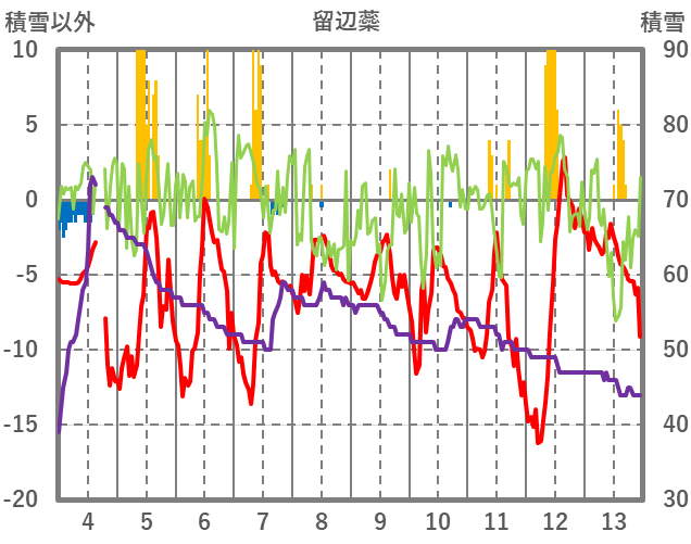 | 日 | 時 | 気温 | 降水 | 風向/風速 | 日照 | 積雪 | 降雪 |