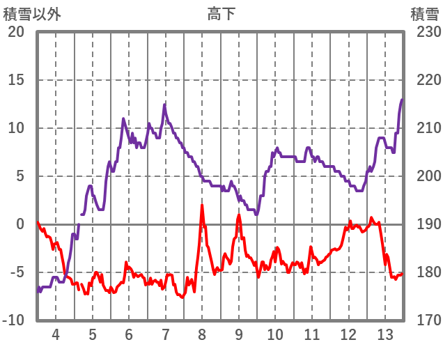 | 日 | 時 | 気温 | 降水 | 風向/風速 | 日照 | 積雪 | 降雪 |