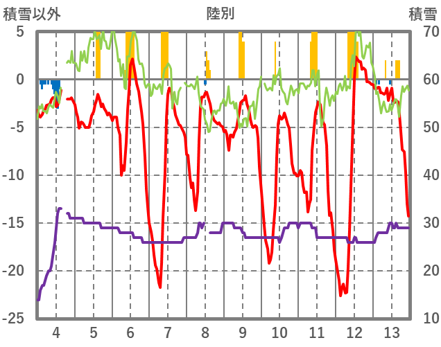 | 日 | 時 | 気温 | 降水 | 風向/風速 | 日照 | 積雪 | 降雪 |