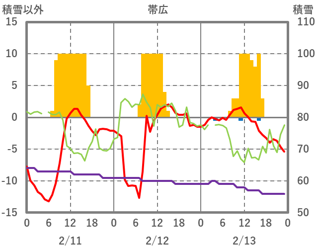| 日 | 時 | 気温 | 降水 | 風向/風速 | 日照 | 積雪 | 降雪 |