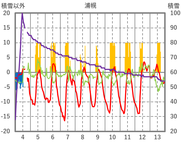 | 日 | 時 | 気温 | 降水 | 風向/風速 | 日照 | 積雪 | 降雪 |