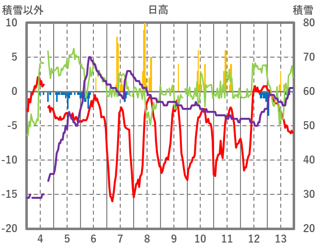 | 日 | 時 | 気温 | 降水 | 風向/風速 | 日照 | 積雪 | 降雪 |