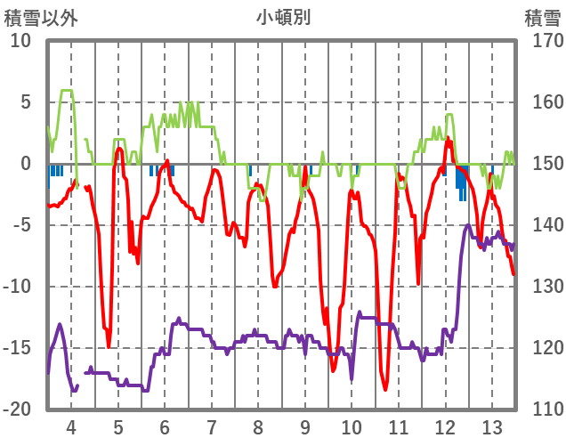 | 日 | 時 | 気温 | 降水 | 風向/風速 | 日照 | 積雪 | 降雪 |
