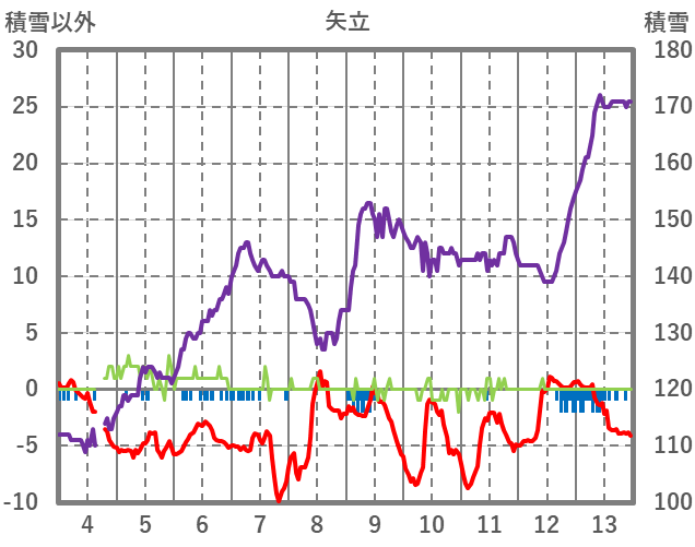 | 日 | 時 | 気温 | 降水 | 風向/風速 | 日照 | 積雪 | 降雪 |