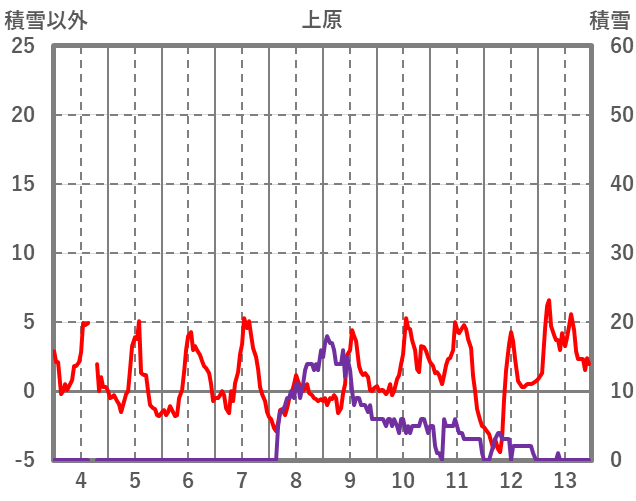 | 日 | 時 | 気温 | 降水 | 風向/風速 | 日照 | 積雪 | 降雪 |