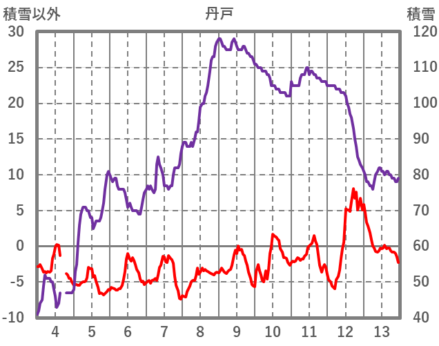 | 日 | 時 | 気温 | 降水 | 風向/風速 | 日照 | 積雪 | 降雪 |