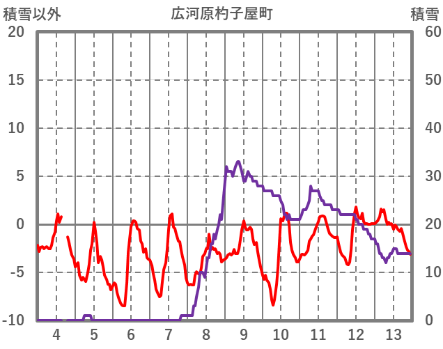 | 日 | 時 | 気温 | 降水 | 風向/風速 | 日照 | 積雪 | 降雪 |