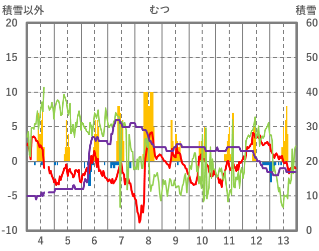 | 日 | 時 | 気温 | 降水 | 風向/風速 | 日照 | 積雪 | 降雪 |