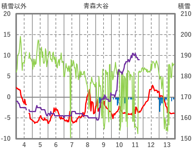| 日 | 時 | 気温 | 降水 | 風向/風速 | 日照 | 積雪 | 降雪 |