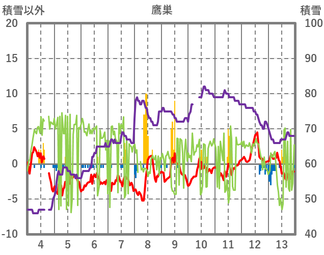 | 日 | 時 | 気温 | 降水 | 風向/風速 | 日照 | 積雪 | 降雪 |