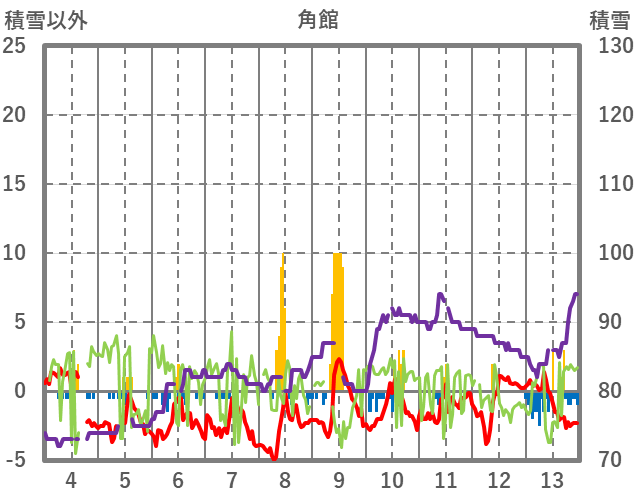 | 日 | 時 | 気温 | 降水 | 風向/風速 | 日照 | 積雪 | 降雪 |