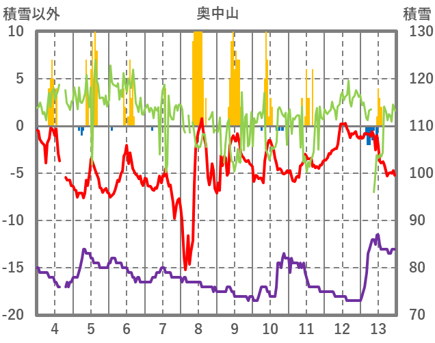 | 日 | 時 | 気温 | 降水 | 風向/風速 | 日照 | 積雪 | 降雪 |