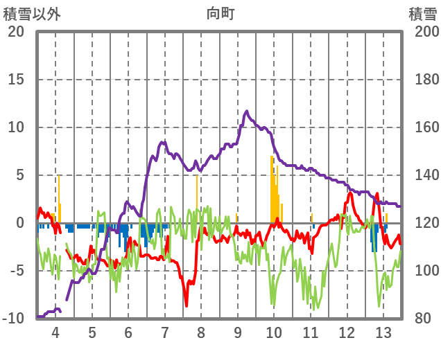 | 日 | 時 | 気温 | 降水 | 風向/風速 | 日照 | 積雪 | 降雪 |