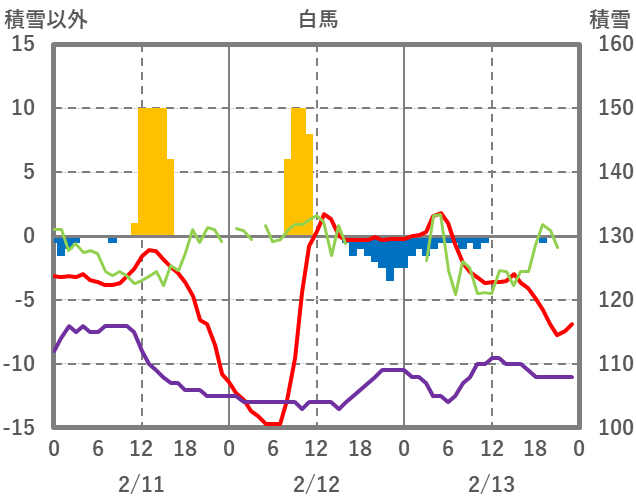 | 日 | 時 | 気温 | 降水 | 風向/風速 | 日照 | 積雪 | 降雪 |
