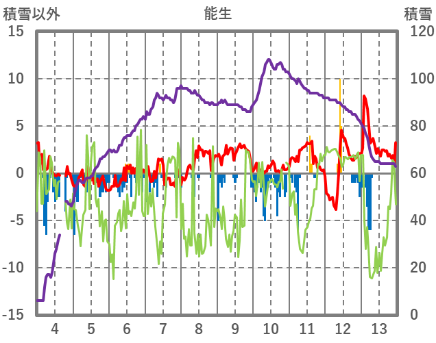 | 日 | 時 | 気温 | 降水 | 風向/風速 | 日照 | 積雪 | 降雪 |