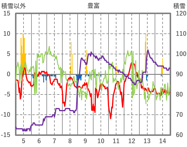 | 日 | 時 | 気温 | 降水 | 風向/風速 | 日照 | 積雪 | 降雪 |