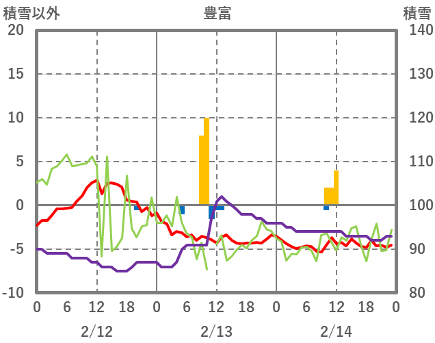 | 日 | 時 | 気温 | 降水 | 風向/風速 | 日照 | 積雪 | 降雪 |