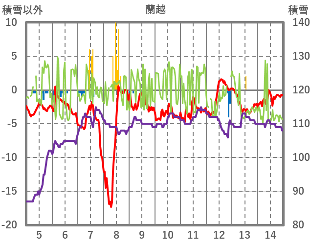 | 日 | 時 | 気温 | 降水 | 風向/風速 | 日照 | 積雪 | 降雪 |