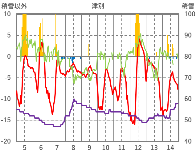 | 日 | 時 | 気温 | 降水 | 風向/風速 | 日照 | 積雪 | 降雪 |